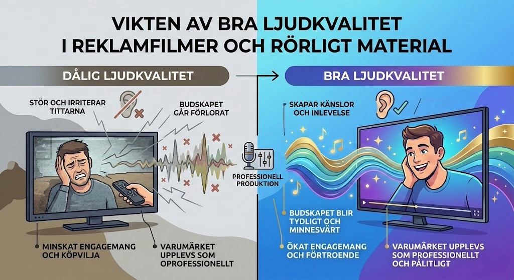 Vi lever i en ljud-fokuserad era. Med podcasts, ljudböcker och röststyrning är ljudet ofta det första intrycket en kund får av ditt företag. Låter det burkigt, amatörmässigt eller obekvämt? Då associeras ditt varumärke med låg kvalitet.